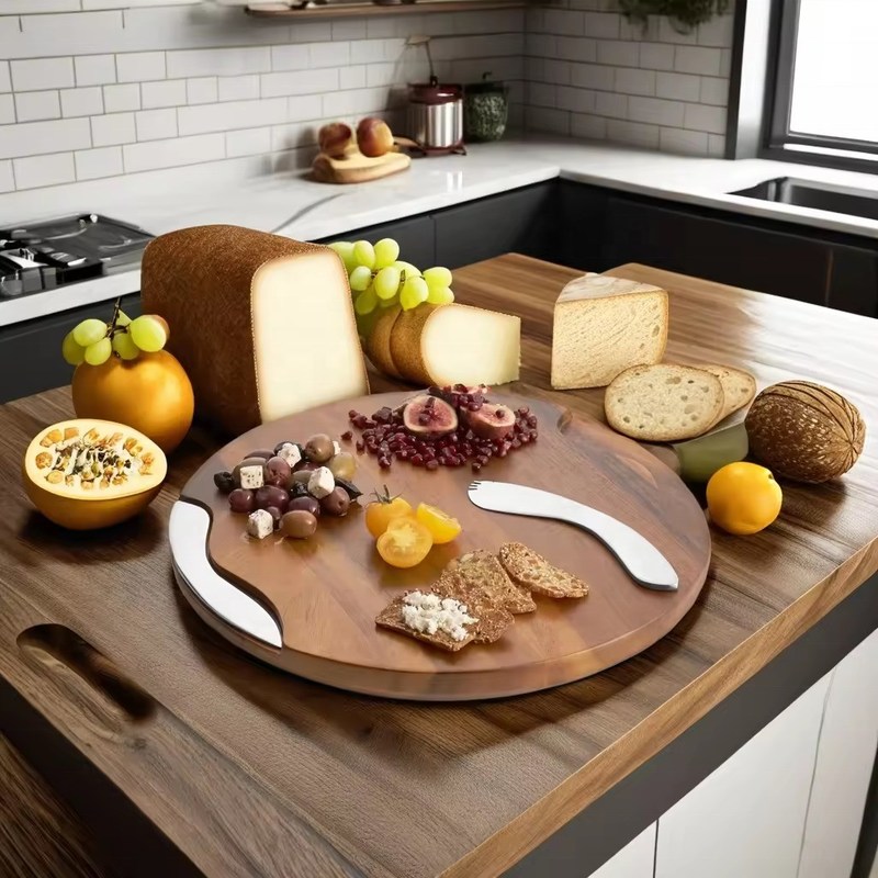 Aangepaste logo Acceptabele ronde groef Acacia snijplank met mes en spreider